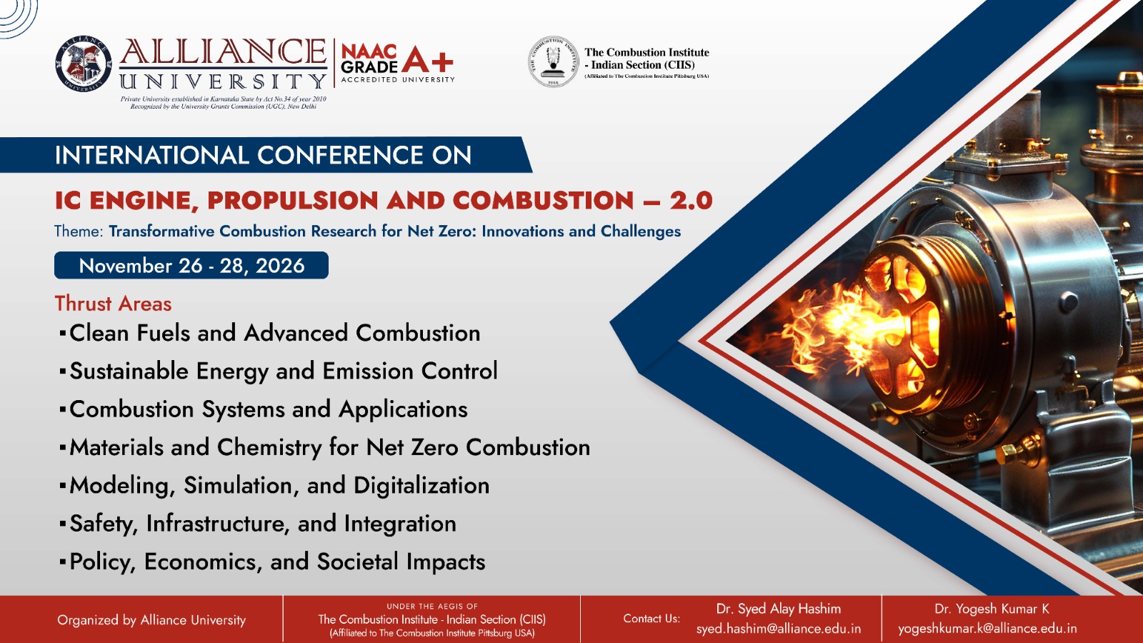 International conference on IC Engine, propulsion and combustion-2.0 is scheduled to be held from 26th to 28th November 2026 at Alliance University – Central Campus, Chikkahadage Cross Chandapura-Anekal, Main Road, Bengaluru, Karnataka 562106.